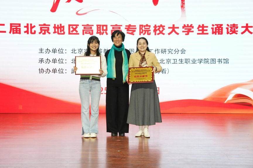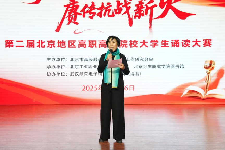 11月26日,由北京市高等教育学会图书馆工作研究分会主办,北京工业职业技术学院、北京卫生职业学院联合承办的“厚植精神沃土,赓传抗战薪火”第二届北京市高职高专院校大学生诵读大赛圆满落幕。大赛旨在纪念抗日战争胜利暨世界反法西斯战争胜利80周年,传承弘扬伟大抗战精神与中华优秀传统文化,引导全市职业院校学生亲近经典,以文聚力、以声传情,以经典之传颂,耀盛世之中华。北京卫生职业学院副校长郝晶晶,北京工业职业技术学院图书馆馆长任凤国,北京地区高等学校图工委委员、北京高教学会图书馆工作研究分会理事、北京工业职业技术学院图书馆副馆长李月清,北京卫生职业学院图书馆馆长段丽敏出席本次大赛决赛。